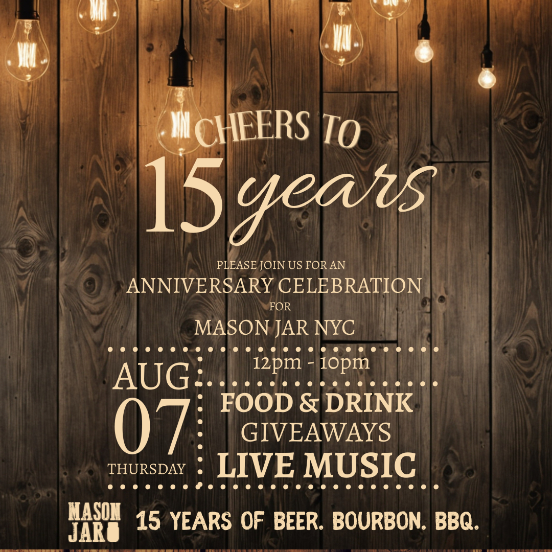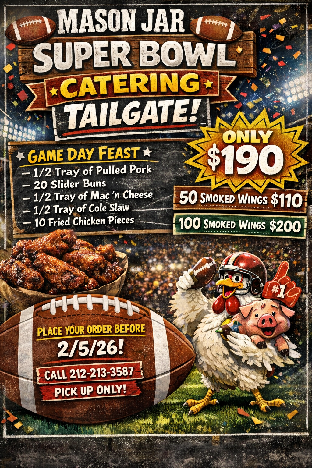 Step into Mason Jar NYC, nestled in the heart of Midtown East, where barbecue meets comfort and Southern hospitality thrives. Since 2010, we have been serving up the best wings you'll find in the city, smoked meats , and classic comfort food that will transport your taste buds to the American South. With an impressive selection of 30 craft beers on tap and over 150 whiskeys, Mason Jar NYC is a true haven for beer and bourbon enthusiasts. Dive into the energetic atmosphere fueled by USC & NY sports, International Soccer, live music, trivia nights, exciting music bingo on Saturdays, and the camaraderie of USC Gamecock fans. Our Kitchen is always open until midnight for those late night cravings!